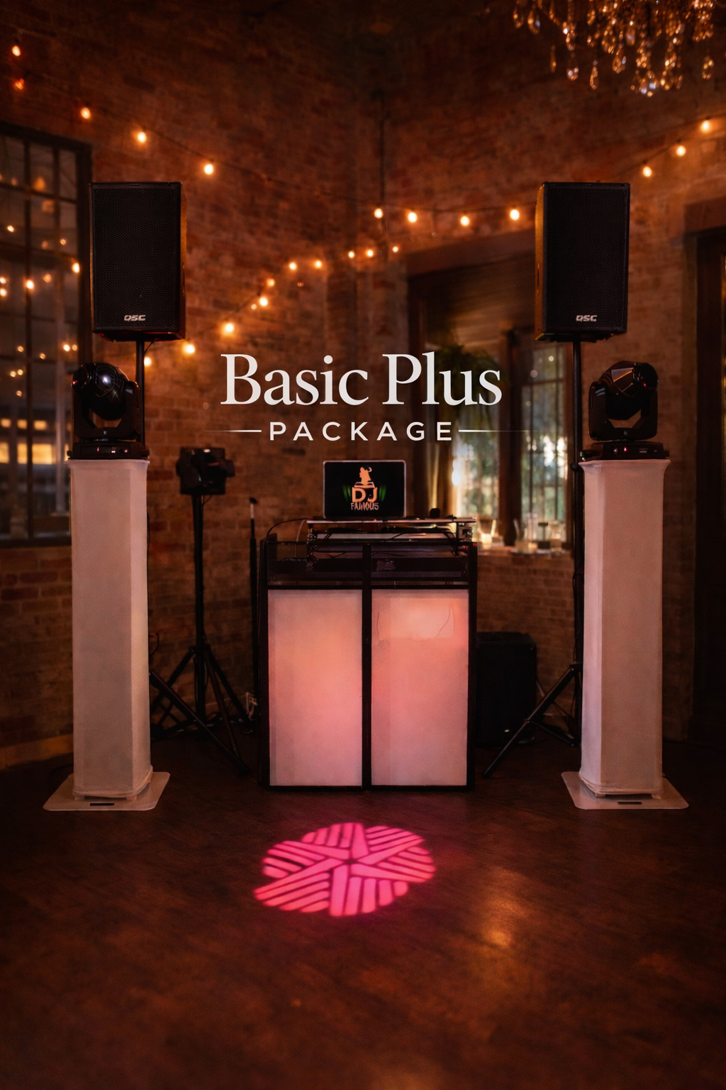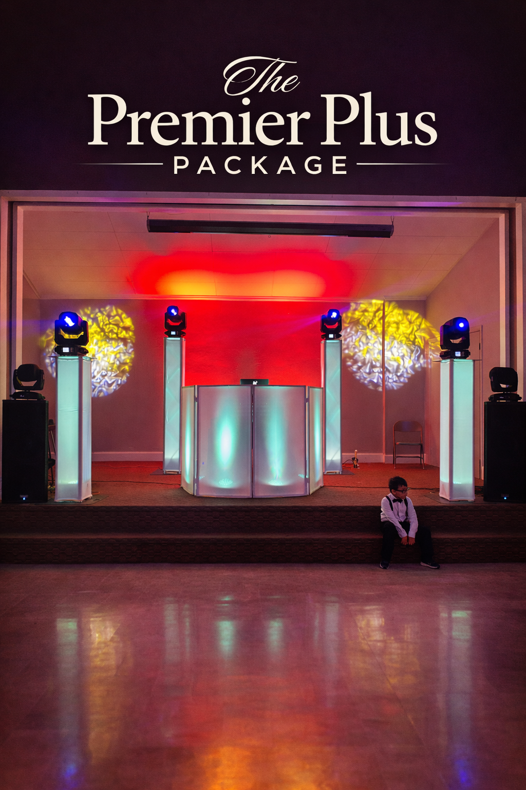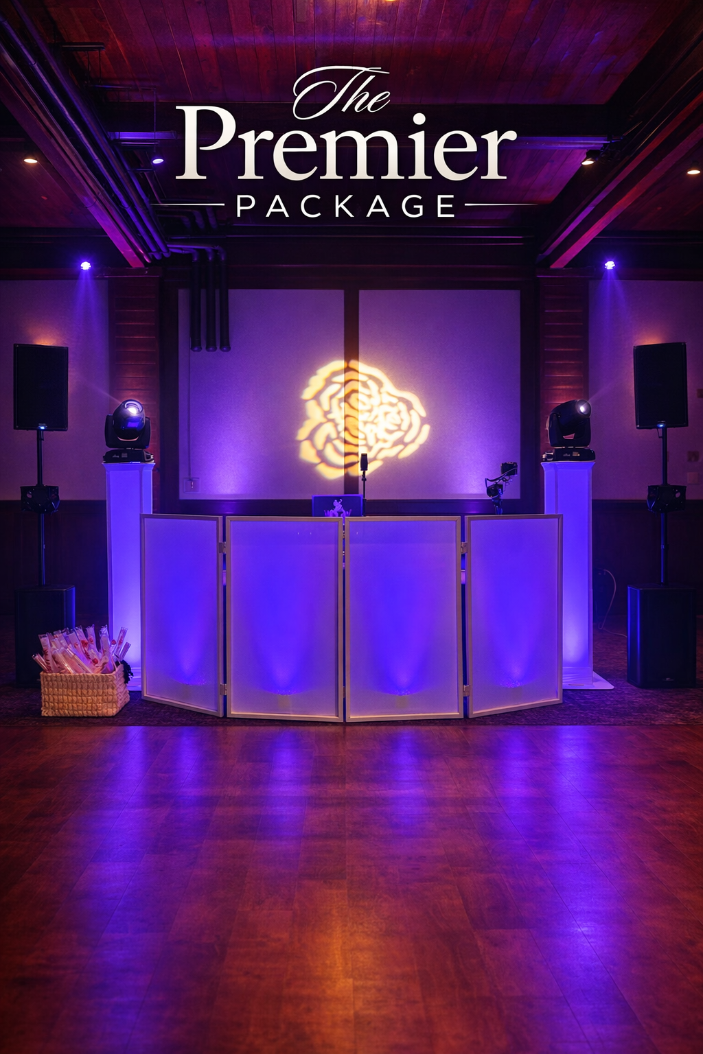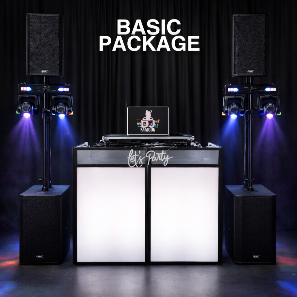 Includes a smaller DJ booth with black or white scrim, uplights for the booth, "Let's Party" neon sign, 2 speaker tops, and 2 sets of rotators for party lighting.