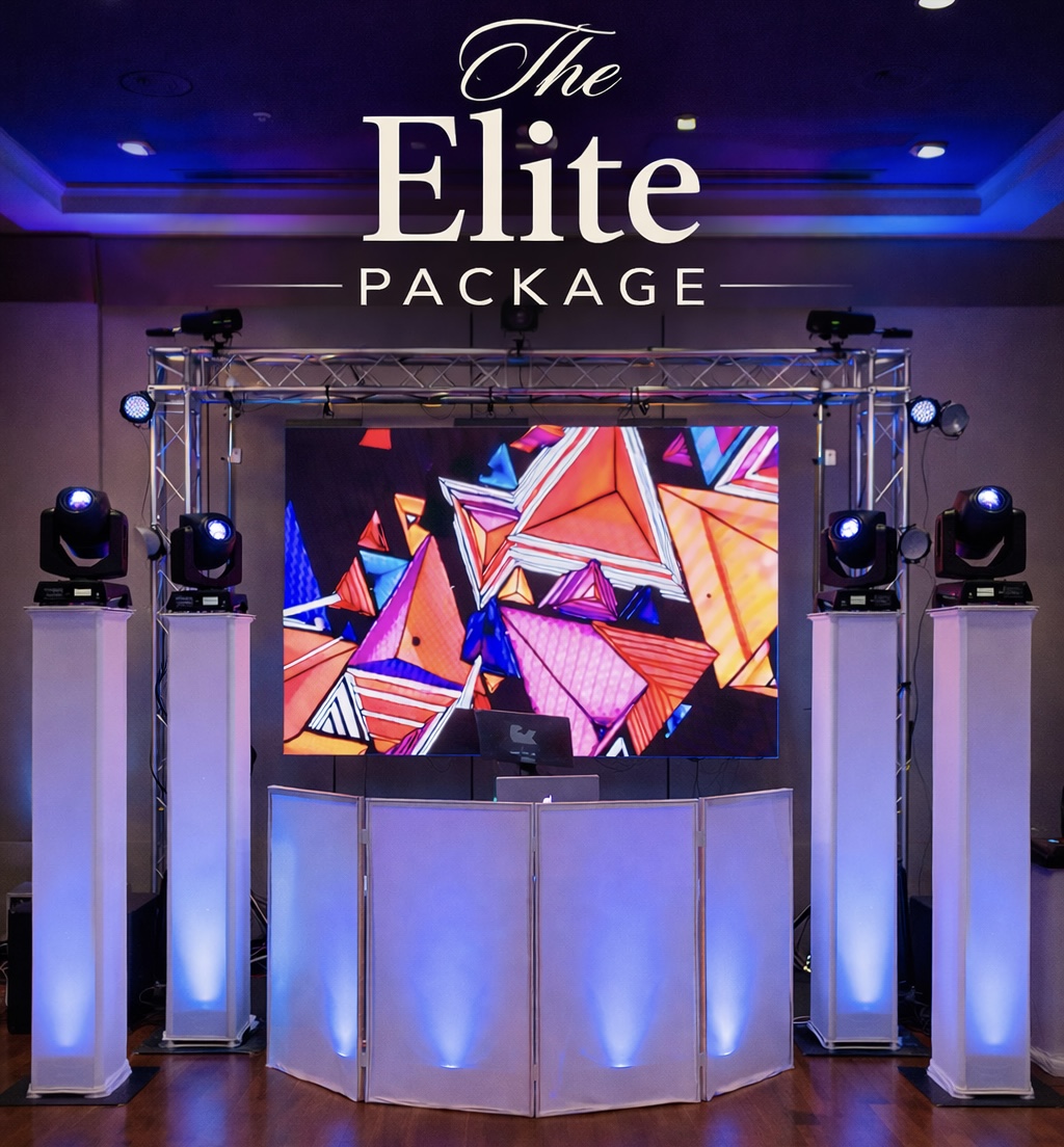 Includes a smaller DJ booth with black or white scrim, uplights for the booth, "Let's Party" neon sign, 2 speaker tops, and 2 sets of rotators for party lighting.