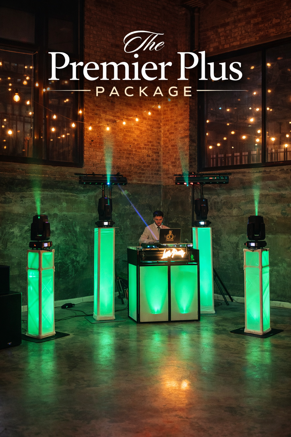 Includes everything in the Basic Package, plus 2 white glowing pillars on each side with rotating lights on top. Includes 2 speaker tops.